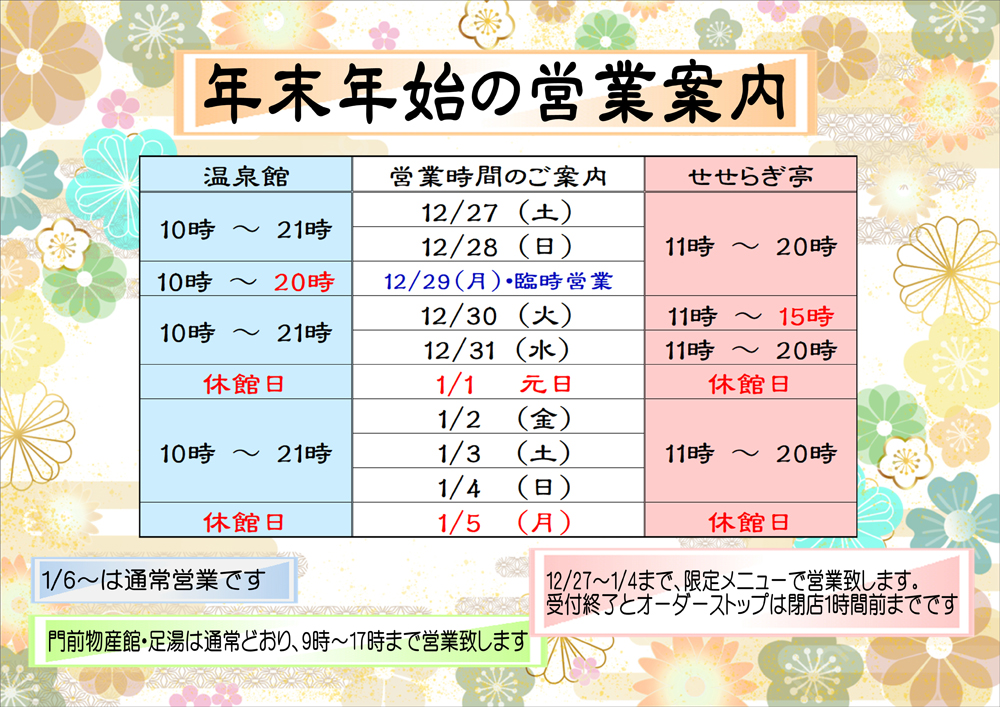 なお、12月30日(火)のせせらぎ亭の営業時間は、15時までとなっております。
